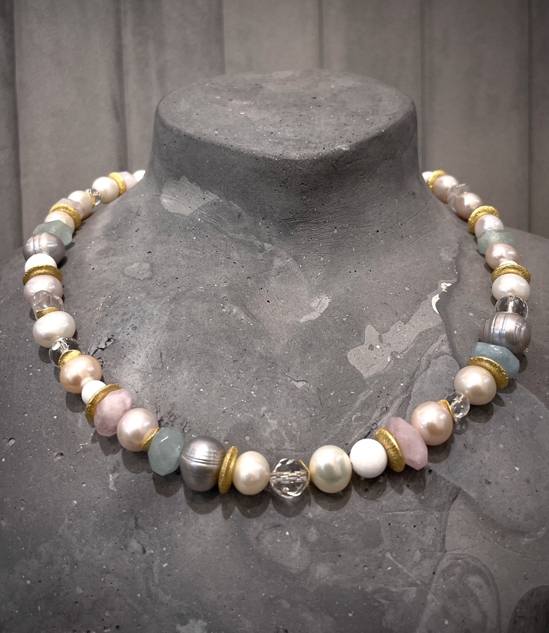 Kette aus Aquamarin, Bergkristall, Süßwasser Perlen und vergoldete 925-/ Silber