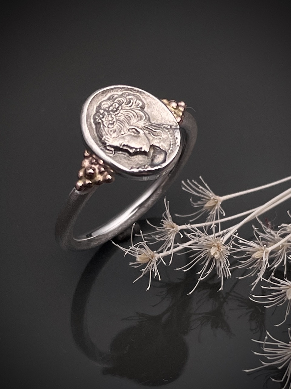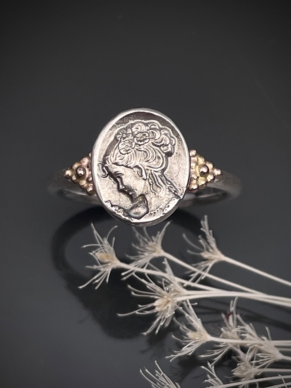 Material: 925/-Silber Applikation: 585/- Rotgold Massiv Ringgröße: 53 (kann auf Anfrage angepasst werden) Ringkopf: ca. 11,7 x 10mm