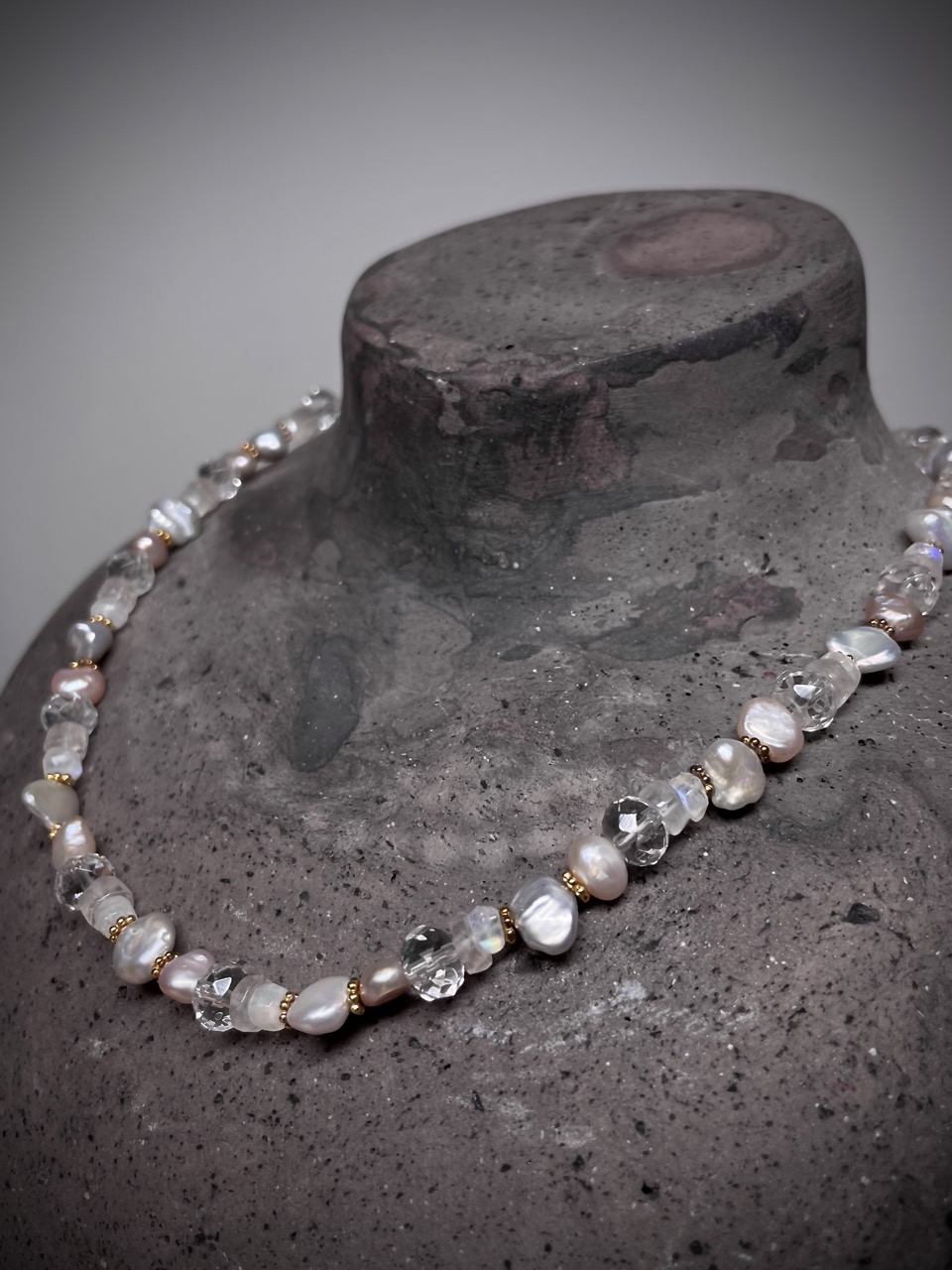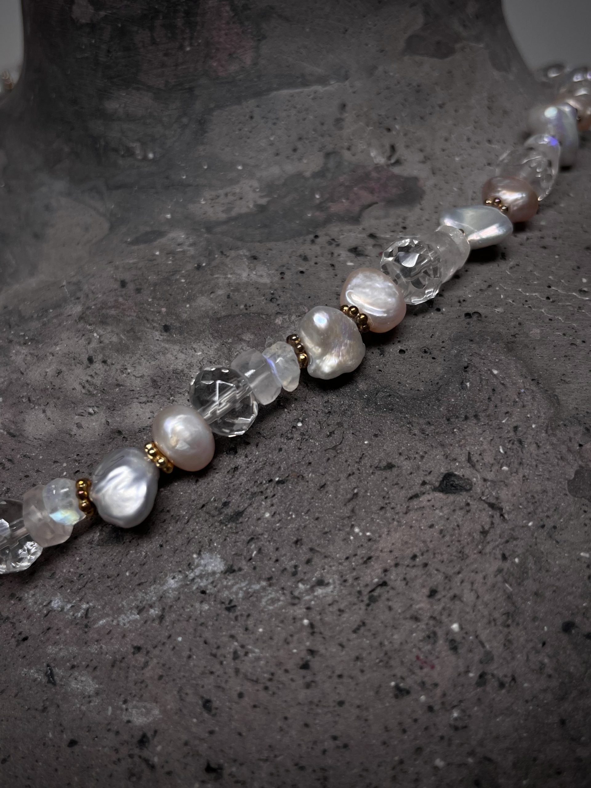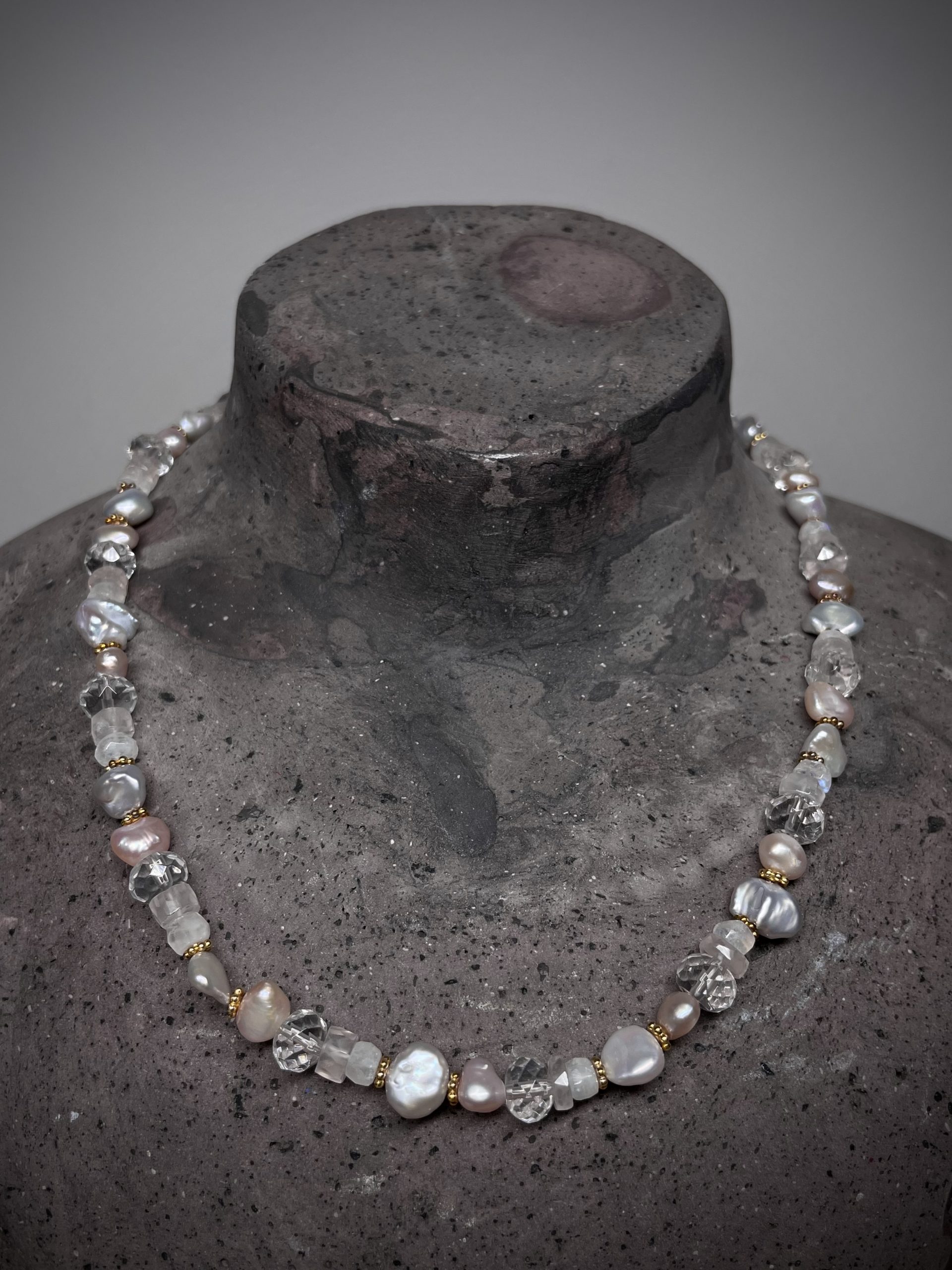Süßwasser perlen Kette, Bergkristall,Rosenquarz, Mondstein. Kastenschloss Silber vergoldet. Kette 43cm lang