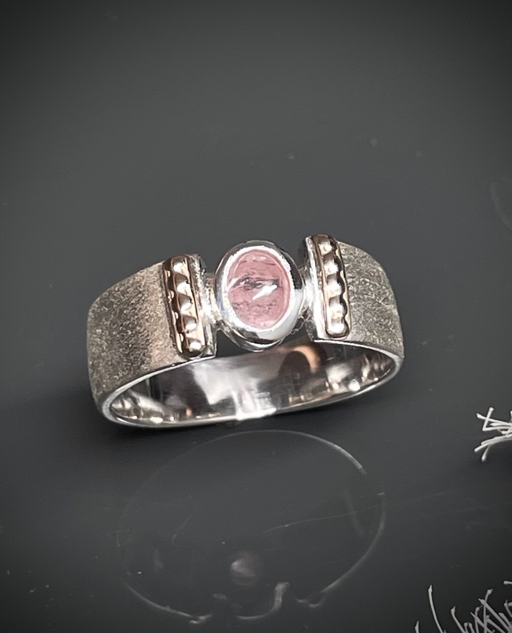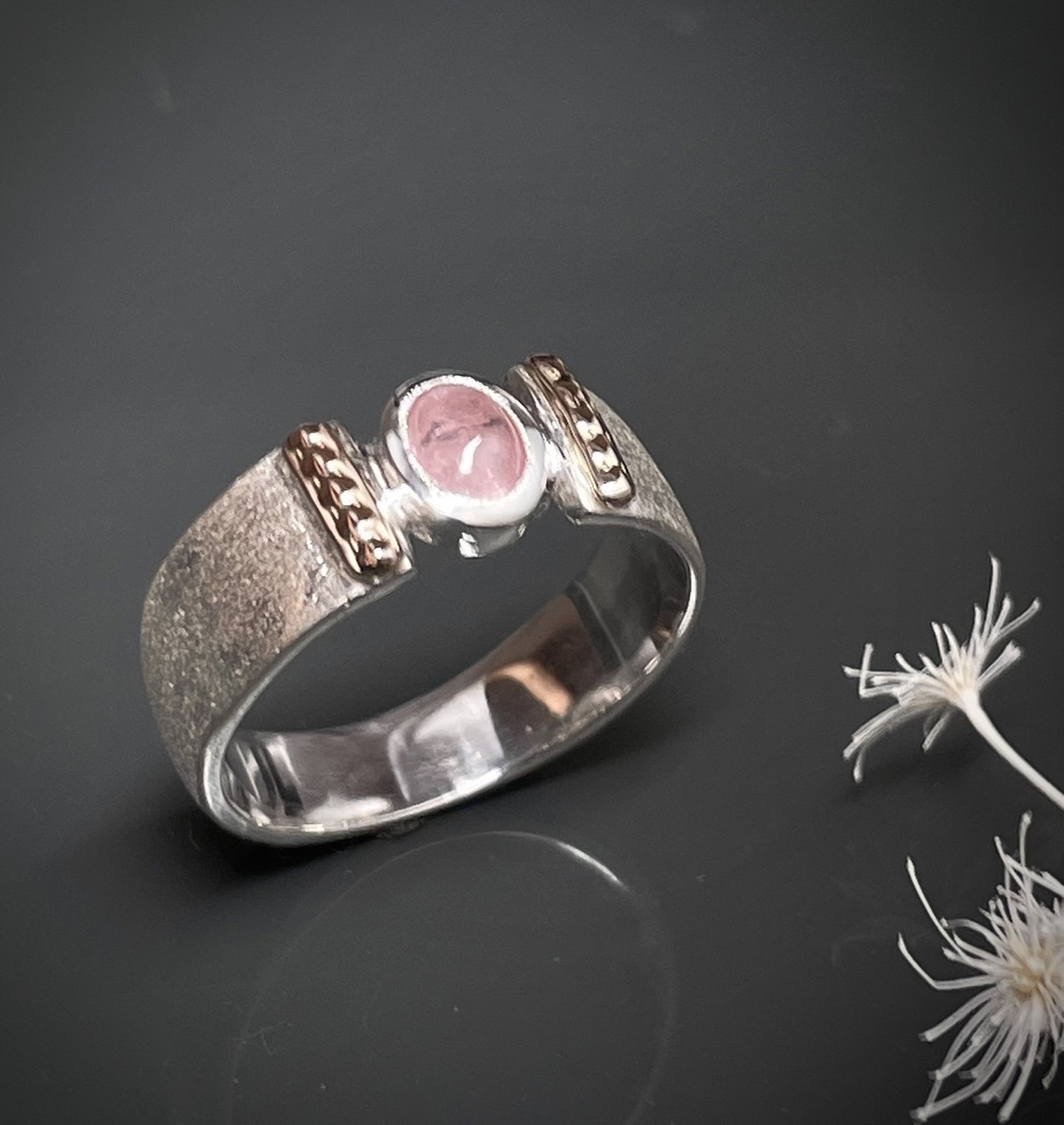 Kugelrand Applikation massiv 585/-Rotgold Steinbesatz:Turmalin Cabochon Rosa Ringbreite oben: 7,3mm Ringbreite unten: 4,6mm Ringgröße: 56,5